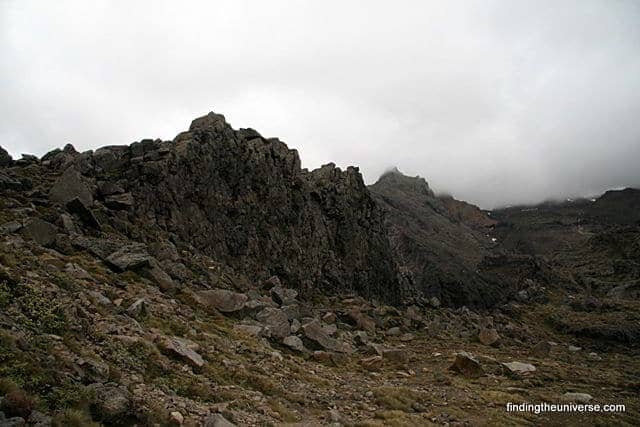 On the day we visited, the cloud was hanging low and grey over the mountain, and the main slopes of Ruapehu were shrouded and foreboding. Beyond the wall was a sheer drop down into a river valley, which wended it’s way away from Ruapehu and towards the conical shape of Mount Doom. Not too much imagination was required to populate the whole area with orcs, elves and lords of evil. No signs were apparent – one of the stipulations of