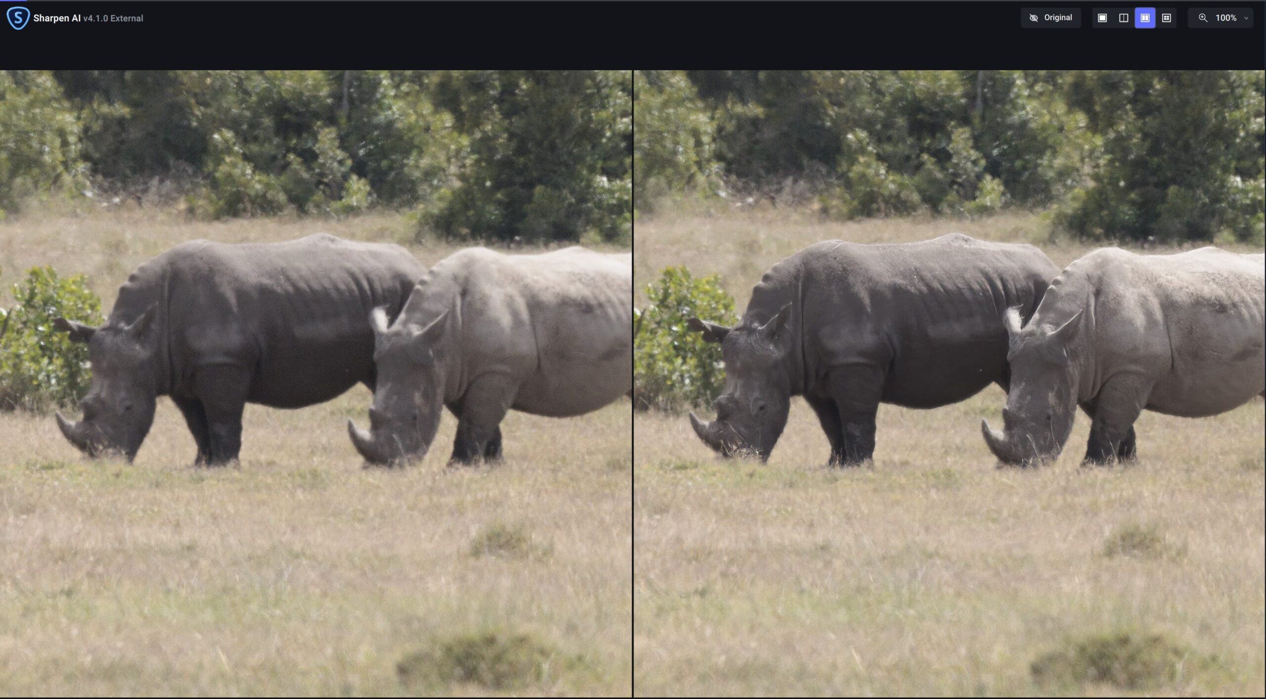 For example, I ran the pair of distant rhinos through Topaz Sharpen AI to see what improvement could be made. Here’s a side by side view of Topaz Sharpen AI, which also has intelligent subject selection so it only sharpens the relevant parts of the image, in this case, the two rhinos. You can click this image for a full size view.