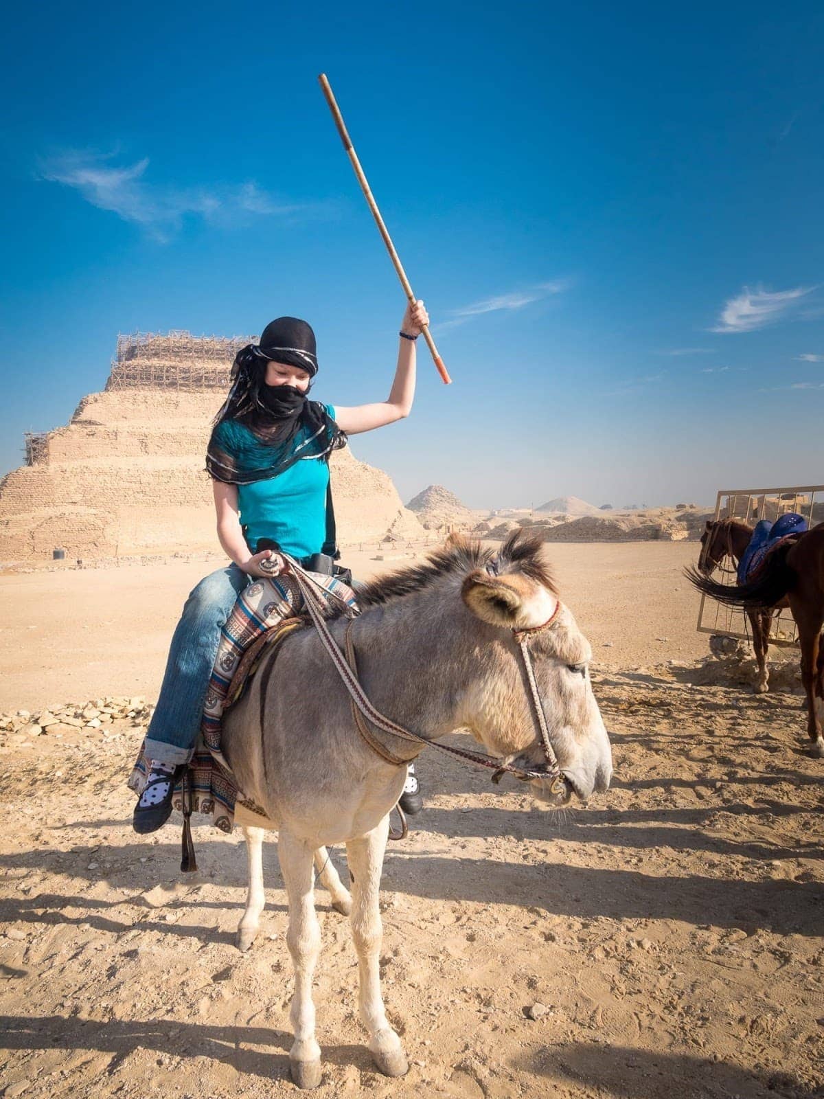 Back to the step Pyramid. We started the tour with a fifteen minute or so talk on the history of pyramid building and the rituals surrounding death in Ancient Egypt, before being given around 20 minutes of free time to explore. In this time we could haggle with the vendors, take advantage of a donkey or camel ride, or just wander and take pictures. Quite a few of the group did take a camel ride, and Jess found herself quite surprisingly hoisted onto a donkey. In exchange for this, we felt obligated to give the man some change who was nice but somewhat pushy. If you don’t want to take part in this sort of activity, you have to be really firm and say no.